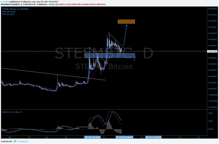 It looks like Steem is preparing for the next move to the upside. We've seen a rejection on the demand zone and if we're breaking the trendline I think we'll see a move up to the 0.00120000 orange zone.