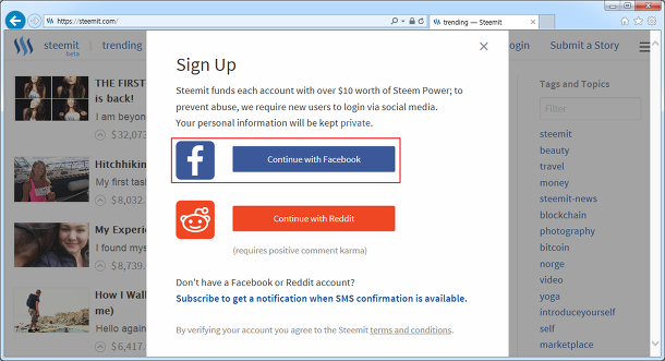 스팀잇에서 인증을 수행하는 소셜 미디어는 페이스북과 레딧이 있습니다. 이번 포스팅에서는 페이스북 계정 인증을 통해 스팀잇에 가입해보려고 합니다. 아래 그림과 같이 페이스북 버튼을 클릭하면 다음 단계로 넘어갈 수 있습니다.