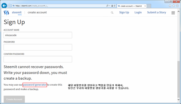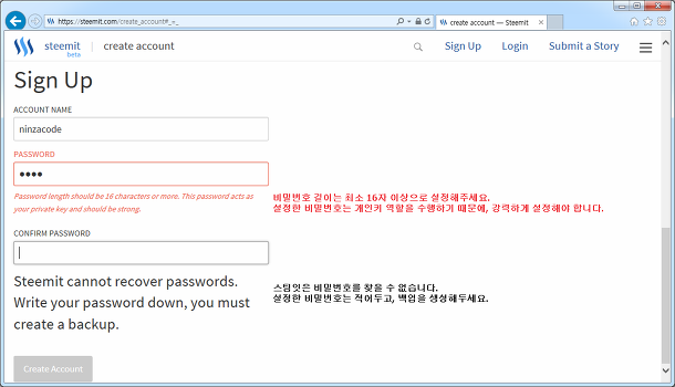 그건 스팀잇은 생성한 계정의 비밀번호를 찾아주는 서비스가 존재하지 않는다는 점입니다. 회원가입 시 비밀번호 재확인란 아래를 보시면 스팀잇에서는 비밀번호를 찾을 수 없기 때문에 설정한 비밀번호는 종이에 적어두고, 백업을 만들어 두라고 명시하고 있습니다.