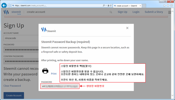 비밀번호를 찾을 수 있는 서비스가 존재하지 않기 때문에 비밀번호를 이렇게 임의로 설정하실 경우, 꼭 생성한 비밀번호를 프린트하신 후 잘 보관하셔야 합니다. 스팀잇에서도 프린트한 종이는 안전한 장소에 보관하라고 명시하고 있습니다.