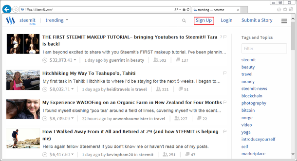 스팀잇 주소에 접근하면 아래 그림과 같은 페이지가 출력됩니다. 해당 페이지에서 상단의 'Sign Up' 메뉴를 클릭하면 회원가입 페이지에 접근할 수 있습니다.