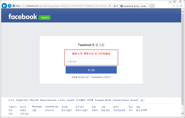 상단의 메뉴에서 페이스북 버튼을 클릭하셨다면, 아래 그림과 같이 페이스북 로그인 페이지에 접근할 수 있습니다. 해당 로그인 페이지에서 기존에 사용하던 페이스북 계정정보를 입력하고 로그인을 수행합니다.
