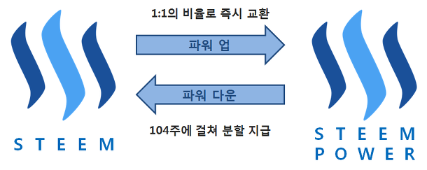 첫번째로... '스팀'입니다. 스팀은 언제든지 전송이 가능하기 때문에 언제든지 거래가 가능한 토큰입니다. 스팀은 스팀파워의 '파워 다운'이라는 과정을 통해 얻을 수 있으며, 파워 다운 시 스팀파워를 104주(약 2년)에 걸쳐 분할하여 스팀으로 지급받게 됩니다. 그리고 스팀을 '파워 업'하면 1개의 스팀을 1개의 스팀파워로 즉시 전환할 수 있습니다. 즉, 스팀을 스팀파워로 전환은 바로할 수 있지만... 스팀파워에서 스팀으로 전환은 거의 2년이 걸리기 때문에 이 부분은 자산관리하실 때 주의하셔야 합니다.