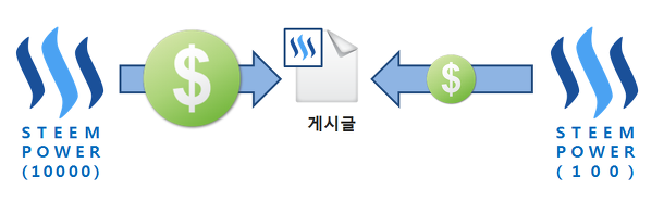 두번째는... '스팀파워'입니다. 스팀파워는 장기간 보유하는 동안 파워를 벌어주고, 포스트를 투표(Voting)했을 때 해당 포스트의 보상에 영향을 주는 토큰입니다. 스팀파워를 많이 보유한 사람이 투표할 수록 투표를 받은 포스트의 보상이 많아지게 됩니다. 즉, 스팀파워가 100인 사람과 스팀파워가 10000인 사람이 포스트 한개를 대상으로 똑같이 투표했을 때, 투표를 받은 포스트는 스팀파워가 10000인 사람으로부터 투표받았을 때 해당 포스트에 매겨지는 달러가격이 높아지게 됩니다.