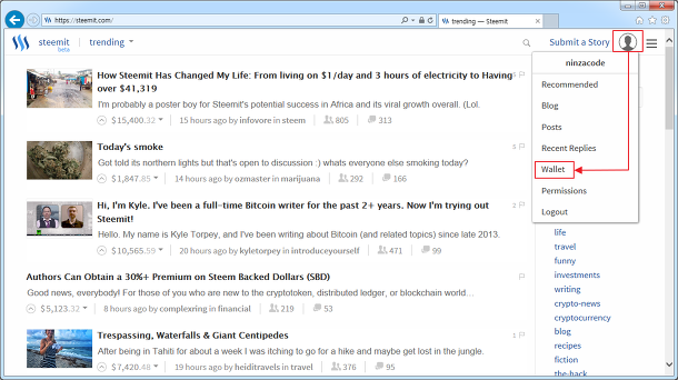 회원가입한 스팀잇 계정으로 로그인하신 후 우측 상단의 프로필 사진을 클릭하시면 아래 그림과 같이 하위 메뉴가 출력됩니다. 펼쳐진 메뉴에서 Wallet(지갑)이 보이시죠? 해당 메뉴를 클릭합니다.