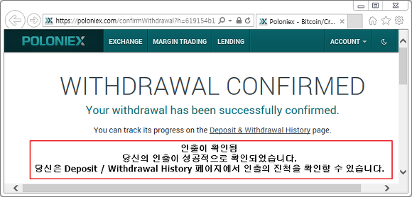 링크를 클릭하시면 인출이 확인되었다는 창이 출력되는데요. 이 때부터 인출요청이 정상적으로 처리되는 것을 의미합니다.