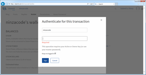 'Transfer' 버튼을 클릭하시면 아래 그림과 같이 로그인한 스팀잇 계정의 Active Key, Owner Key나 마스터 비밀번호를 입력해야 하는 창이 출력됩니다. 여기에 자신이 설정한 비밀번호를 입력하고 'Sign' 버튼을 클릭하면 정상적으로 스팀 전송 요청이 처리됩니다.