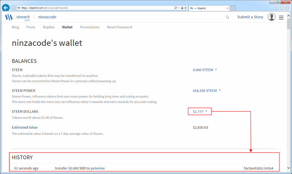 지갑 페이지를 보시면 기존에 '31.777'이던 스팀달러가 '1.777'로 줄어있는 것을 확인하실 수 있을겁니다. 물론, HISTORY를 통해 '30' 스팀달러가 폴로닉스 계정으로 전송되었다는 것도 알 수 있죠.