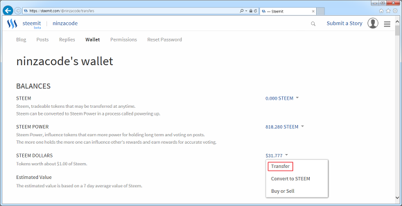 이렇게 우리는 폴로닉스에 스팀을 전송하기 위해서는 입금 주소인 'poloniex'와 메모를 사용해야 한다는 것을 알았습니다. 그럼 이제 스팀을 전송하기 위해... 스팀잇 계정으로 로그인하고 지갑에서 스팀을 클릭합니다. 지갑을 클릭하시면 'Transfer' 메뉴가 보이실텐데요. 해당 메뉴를 이용하여 스팀을 전송할 수 있습니다.