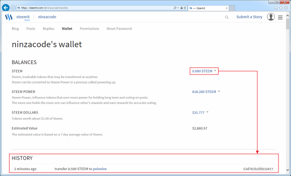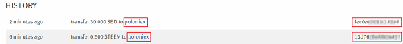 스팀 전송 요청이 정상적으로 처리되면서 기존에 지갑에 있던 '0.500' 스팀이 빠져나간 것을 확인할 수 있습니다. 그리고 지갑 하단의 HISTORY에서는 폴로닉스 입금 주소인 'poloniex'로 스팀이 전송되었다고 출력됩니다. 해당 로그의 우측에는 메모를 확인할 수 있지요.