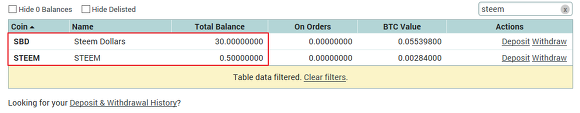 이렇게 스팀잇에서 스팀과 스팀달러를 보내놓고 몇 분 뒤, 폴로닉스 계정의 지갑을 확인해보면 아래 그림과 같이 스팀잇 계정에서 보낸 스팀과 스팀달러가 잘 입금되어 있는 것을 확인할 수 있습니다.