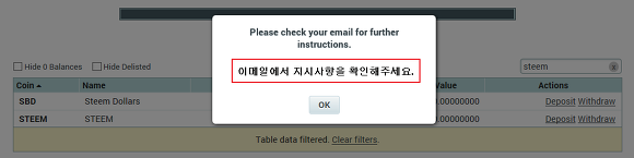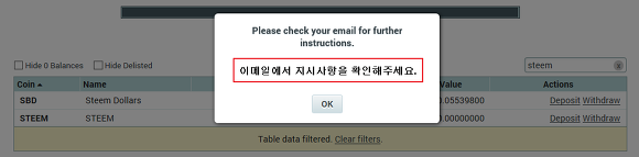 'Withdraw' 버튼을 클릭하면 아래 그림과 같이 이메일의 지시사항을 확인하라는 팝업창이 출력됩니다.