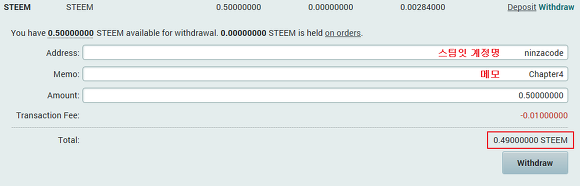 폴로닉스 계정으로 로그인하신 후, STEEM 지갑에서 'Withdraw'를 클릭하시면 아래 그림과 같은 창이 출력되실텐데요. 여기서는 위에서부터 차례로 입금 주소, 메모, 입금액을 입력하시면 됩니다. 저는 제 계정으로 보내야할테니... 입금 주소에는 'ninzacode'를 입력했구요. 메모는 작성하지 않으셔도 상관없습니다. 전 테스트 겸 'Chapter4'라고 입력해봤습니다. 그리고 마지막으로 입금액에는 처음 받은 스팀을 그대로 돌려주기 위해 '0.500' 스팀을 입력합니다. 하지만... 실제로 전송되는 스팀은 '0.49'이죠...