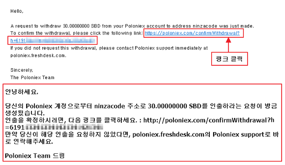 폴로닉스 가입 시 설정한 메일을 확인해보시면 아래와 같은 내용의 이메일이 도착한 것을 확인하실 수 있을겁니다. 번역해보면... 인출요청이 생성되었는데, 해당 요청을 확정하려면 링크를 클릭하라는 내용입니다. 저희는 인출하기로 했으니... 링크를 클릭합니다.