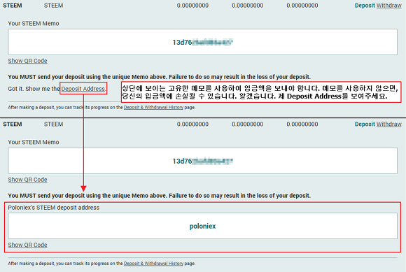 외부 거래소인 폴로닉스에 스팀을 전송하려면 먼저, 스팀을 전송받을 주소를 알아야겠죠? Poloniex 계정을 로그인하시고 [Balances] > [Deposits & Withdrawals] 메뉴에 접근하시면, 현재 거래소에서 취급하는 코인 목록이 출력됩니다. 해당 창에서 스팀(Steem)을 찾은 후 입금을 의미하는 'Deposit' 버튼을 클릭해보면 아래 그림과 같이 'STEEM Memo'가 출력되는 것을 확인할 수 있습니다. 그리고 그 아래에는 상단에 보이는 고유한 메모를 사용해서 입금액을 보내야 한다고 설명하고 있습니다. 만약, 메모를 사용하지 않으면 입금하려는 금액이 손실될 수도 있다네요.