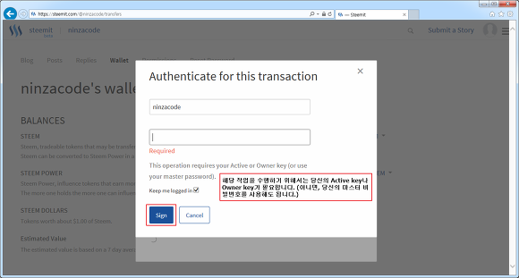 로그인한 스팀잇 계정의 Active Key, Owner Key나 마스터 비밀번호를 입력해야 하는 창이 출력되면 자신이 설정한 값을 입력하고 'Sign' 버튼을 클릭합니다.