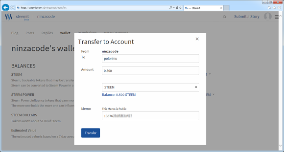 'Transfer' 메뉴를 클릭하면 아래 그림과 같이 스팀을 입금할 주소와 입금액, 메모를 입력하는 창이 출력됩니다. 전 이번에 '0.500' 스팀 전부를 보내볼텐데요. 출력된 창의 맨 윗부분인 'To'에는 보낼 주소를 입력합니다. 여기에는 'poloniex'를 입력하시면 됩니다. 다음으로 'Amount'는 보내고자 하는 스팀의 양을 입력하는 곳으로 전 '0.500'을 보내기로 했으니... 그대로 써넣겠습니다. 마지막으로 메모에는 위에서 확인했었던 폴로닉스 계정의 메모를 입력하시면 됩니다.