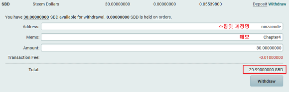 이참에 스팀달러도 같이 보내보도록 하죠. 이제는 아주 쉽지 않으세요? 스팀과 동일한 방식으로 입금 주소에 제 스팀잇 계정인 'ninzacode'를 입력하고... 이번에도 테스트 문구인 'Chapter4'를 입력해 봤습니다. 입금액 처음 받은 그대로인 '30'을 입력했으나, 이번에도 수수료 '0.01'이 발생하는군요.ㅠㅜ