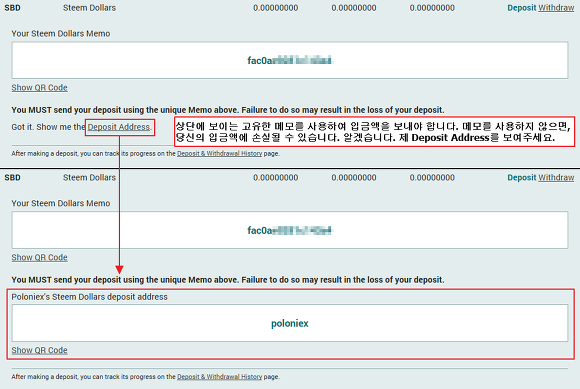스팀달러(Steem Dollar)도 스팀과 동일한 방식으로 외부 거래소에 전송할 수 있습니다. 폴로닉스에 로그인하신 후 [Deposits & Withdrawals] 메뉴에서 스팀달러 'Deposit' 버튼을 클릭하면 스팀과 유사하게 스팀달러 메모가 출력됩니다. 그 아래로 보이는 문구 또한 스팀과 똑같군요. 여기서도 'Deposit Address'를 클릭하면 폴록닉스 입금 주소가 'poloniex'로 출력됩니다.