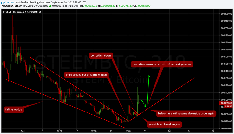 Steem is recovering as we have previously forecast after breaking out of the falling wedge to the upside. The move to the upside is promising and we now look like a new up trend is developing which would mean further recovery in the coming days. I am now expecting a small correction to the downside towards 0.00088503 area before the next lag up begins. If Steem is unable to sustain this up trend and price is indeed to move below 0.00079427 it means once again the main down trend is too powerful to be even corrected decently and more downside would follow with new lows.