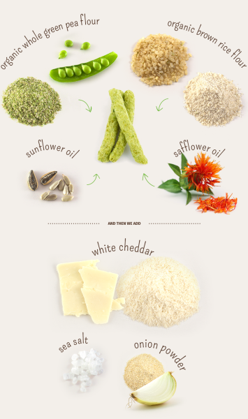 Состав: органическая цельная мука зеленого горошка, органическая мука коричневого риса, органическое подсолнечное масло, органическое масло сафлора, морская соль, органический сыр чеддер, органический луковый порошок, молочнокислый порошок, лимонная кислота, фосфат натрия.