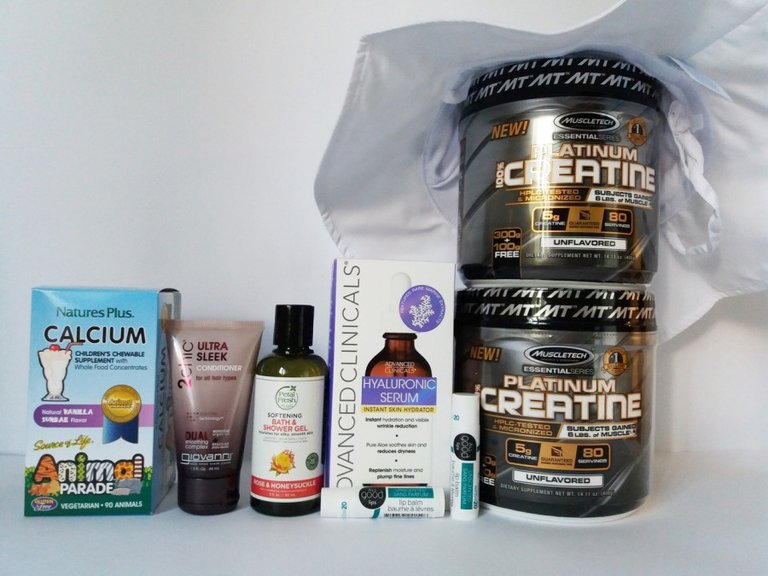 Вот такая славная "малышка" - детский кальций, парочка пробников для волос, сыворотка, солнцезащитная шляпа для ребенка и бальзамы для всех, и супер-мега-выгодный креатин!