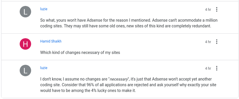 As you can see from the following screenshot a Google product expert calmly and compassionately explains to one of the applicants: "... why exactly your side would have to be among the 4% lucky ones to make it". This almost sounds like Dirty Harry went to town the only missing part at the end was "Well, do ya, punk?".