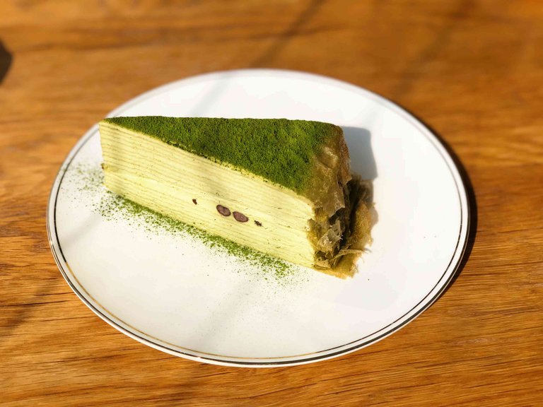 这道抹茶千层真是比我所看到过的大多数千层蛋糕都要精细得多,可以看出真的有很多层,制作这份甜品也一定相当复杂,稍不注意就会影响蛋糕的整齐感。