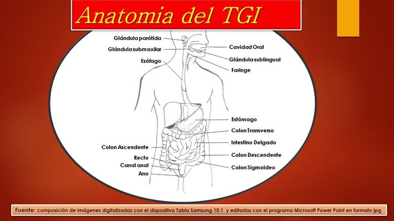 Se estima que el TGI tiene una longitud aproximada de 9 metros desde la orofaringe (boca) hasta el ano, incluyendo los segmentos denominados esófago, estómago, intestino delgado e intestino grueso. Trabajan en conjunto con los dientes, la lengua, glándulas salivales, hígado, vesícula biliar y páncreas.