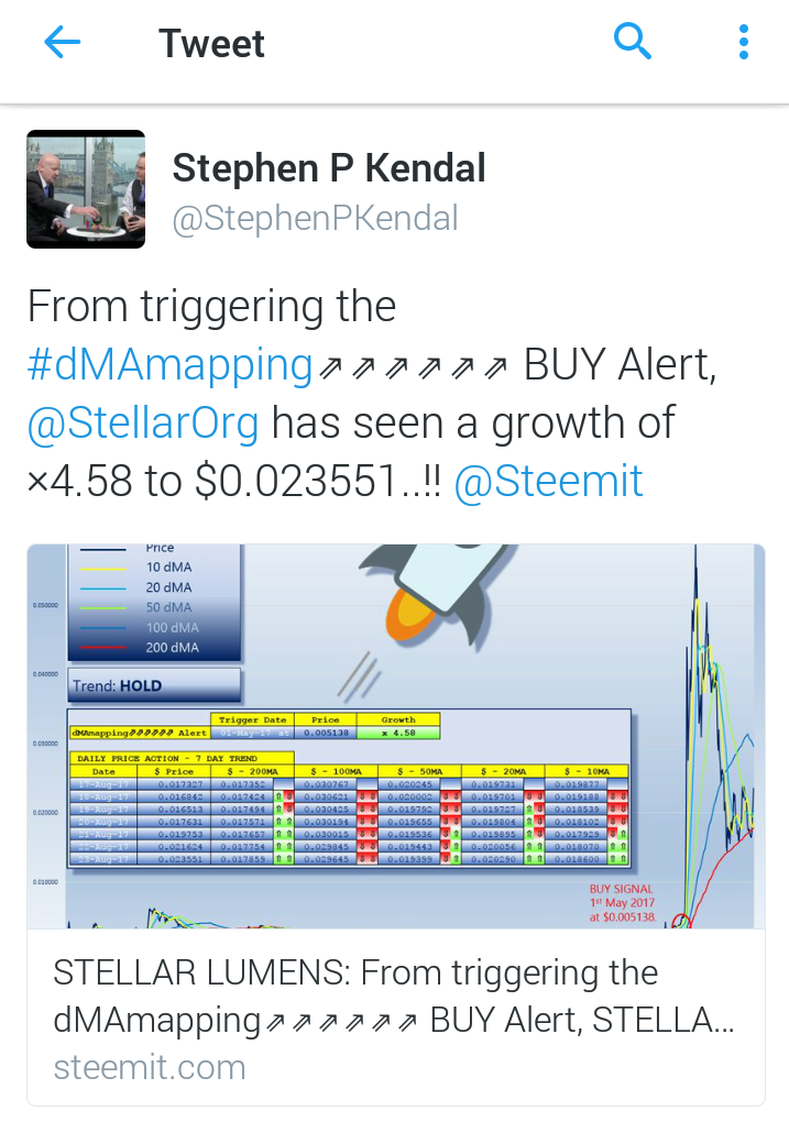 STELLAR LUMENS triggered a dMAmapping⇗⇗⇗⇗⇗⇗ BUY Alert Signal on 1st May 2017 at $0.005138.