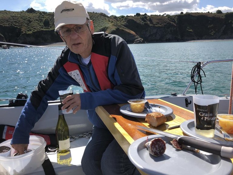 Past the Saint Quay passes, the wind begins to rise and we send the genoa. The idea is even to go behind the island of Mauve. Fact, here we are at Gwin Zegal under a radiant sun. For those who do not know, it is a rare port accessible only by the cliff (and what a cliff!) With wooden piles to fix the boats! In short, a magical place. Slow down, we descend the anchor. It's good, we are posed and we can prepare for lunch! The fishing was lean but the single mackerel is of good size!