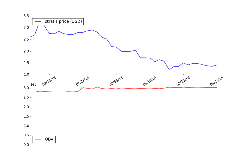 The graph below shows the OBV applied to the price of Stratis using daily price data for the last 40 days.