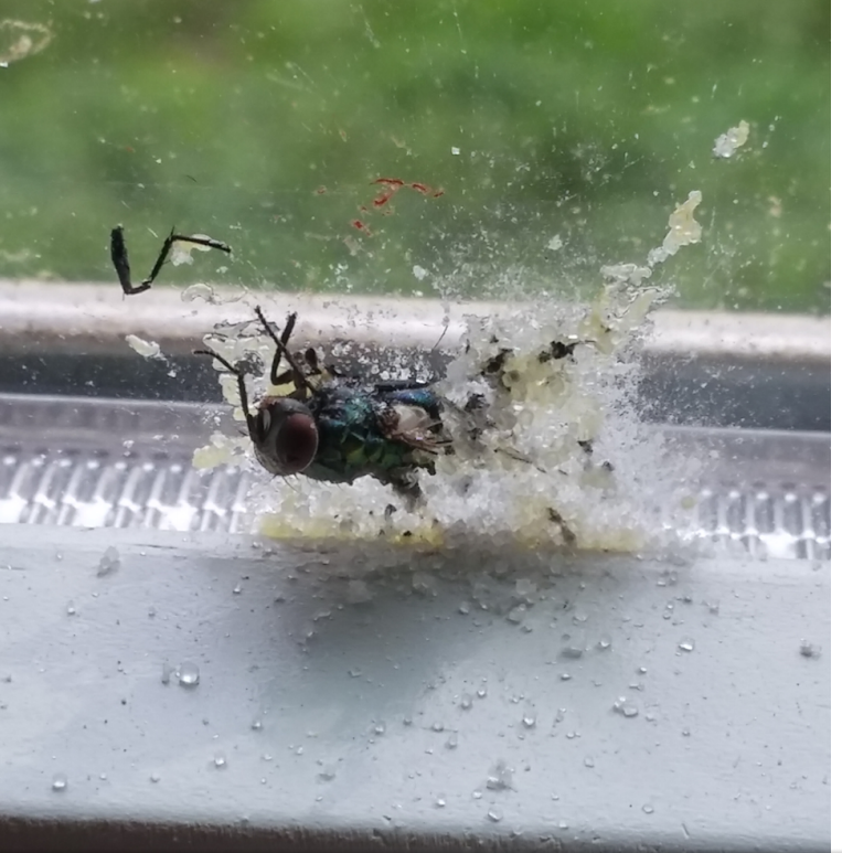 After presenting him the gift, we spent the next 4 hours or so hunting down any insect we could find for a kill shot. Not only does it work on flys, but it works on bees, wasps, mosquitos, aphids, small beetles. Its a fucking beast!! Just look at that fly being demolished below.