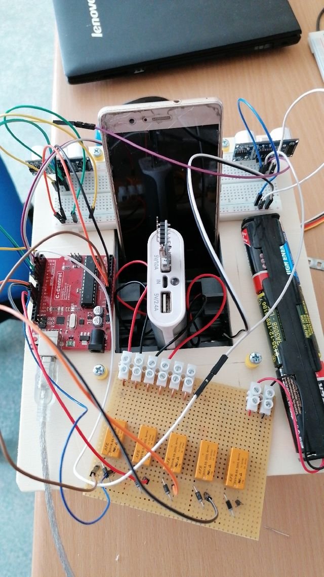 I am using the Arduino Uno as the main controller. It controls the two motors and 3 ultrasonic distance measurement sensors to prevent crashing into walls. I am using my old mobile phone as the camera and a raspberry pi to process it. The software I wrote by myself in python with opencv and numpy. The communication between my pi and the arduino is based on the nodemcu (ESP-12, which is 5v tolerant). It talks via serial communication and TCP.