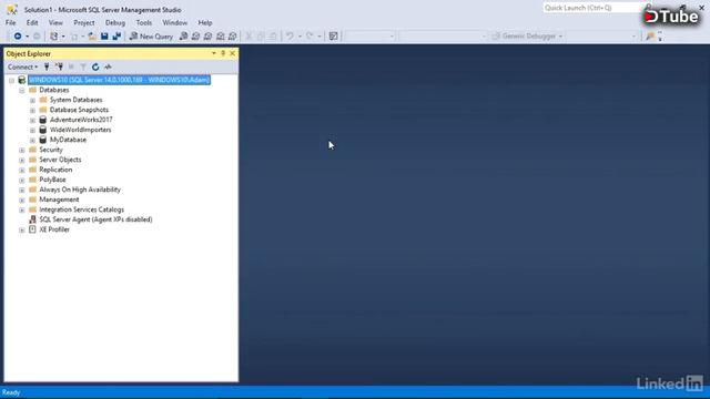 - [Instructor] In order to store data in a database, we need to create a table. The structure of a table is critical in creating a database that's easy to navigate and retrieve information from later. To create a new table in our custom database, I'll go ahead and expand the Databases node and find the database that we created called MyDatabase, then I'll expand that open and find the Tables folder. I'll right-click on it, point to New, and then click on Table. This will activate a second window where we can define the columns that'll make up the structure of our table. We simply need to give each column a name, define the type of data that it'll store, and then choose whether it'll be a required piece of information, which is the default state, or if we place a check in this box called Allow Nulls, we'll define an optional column that can be left blank when entering data.