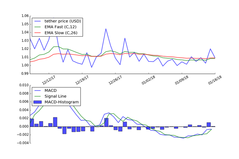 The graph below shows the MACD applied to the price of Tether using daily price data for the last 40 days.