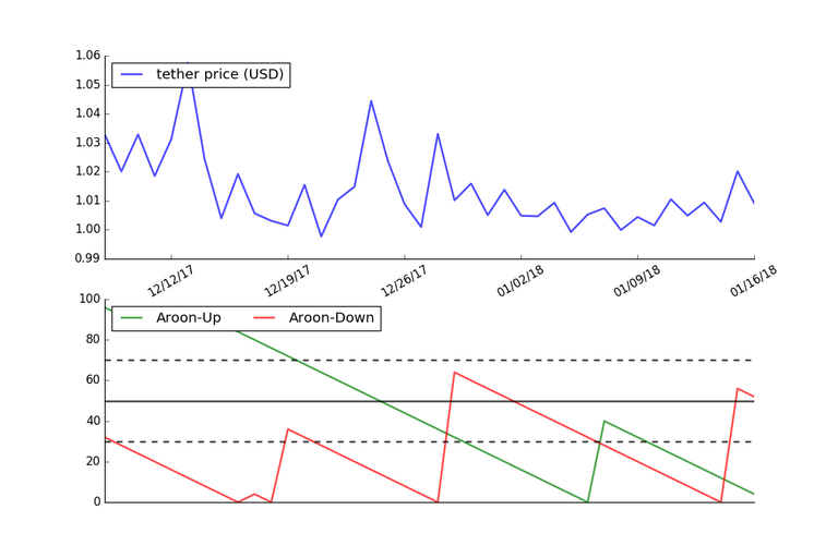 The graph below shows the Aroon Indicator using the price of Tether over the last 40 days.