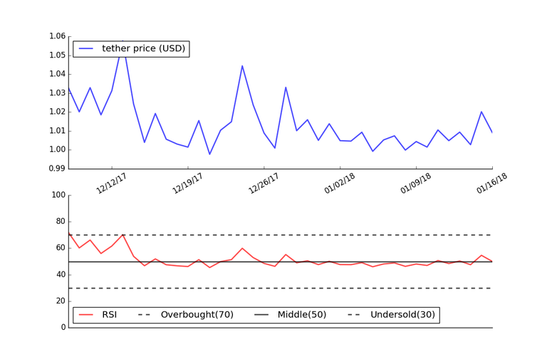Since the RSI is currently between 30 and 70, this would indicate that Tether is neither overbought or oversold and that no material price change is expected.