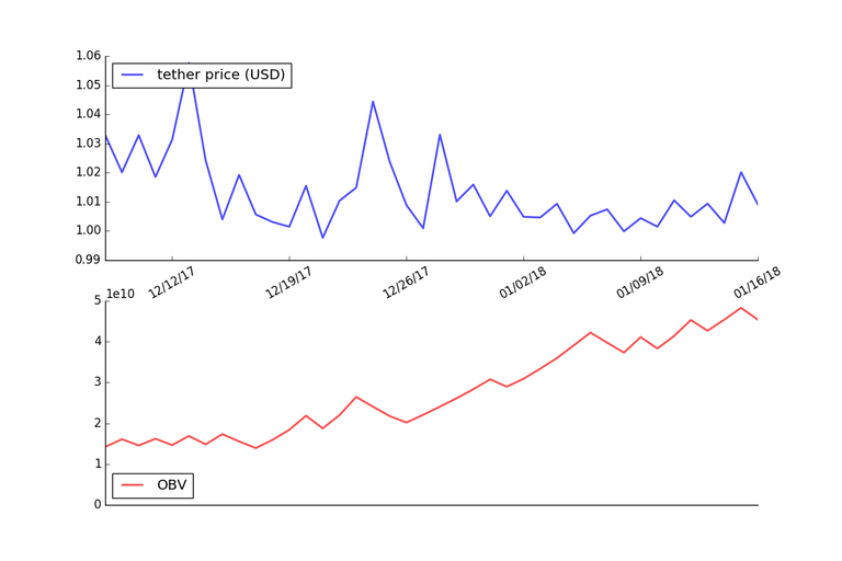 The graph below shows the OBV applied to the price of Tether using daily price data for the last 40 days.