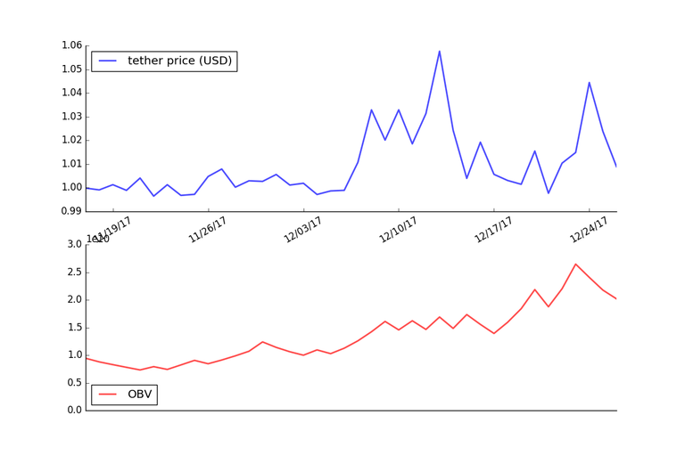 The graph below shows the OBV applied to the price of Tether using daily price data for the last 40 days.