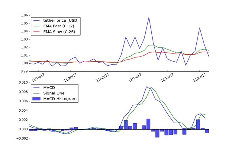 The graph below shows the MACD applied to the price of Tether using daily price data for the last 40 days.