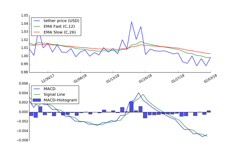 The graph below shows the MACD applied to the price of Tether using daily price data for the last 40 days.