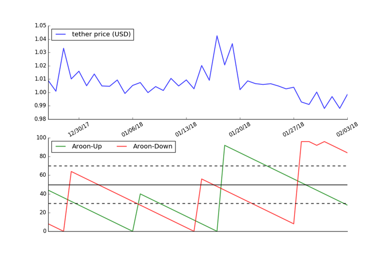 The graph below shows the Aroon Indicator using the price of Tether over the last 40 days.
