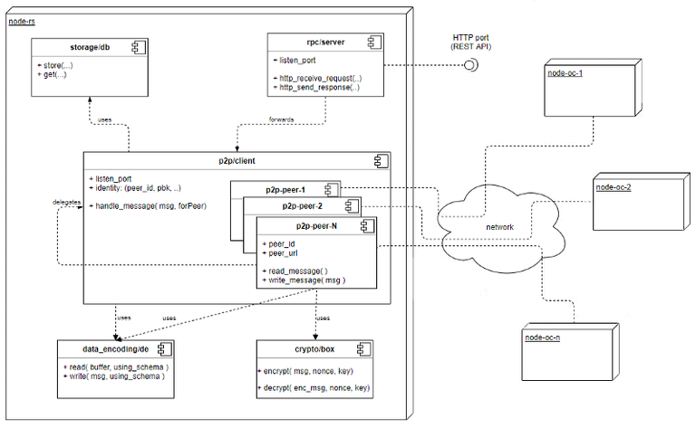 - They use a rpc/server: the component used for the implementation of node-rs REST API. Using the nodes REST api, the user is able to get insights about the current state of the node as well as execute commands on the node
