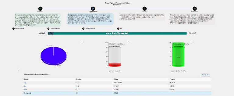 - Second step of the voting via link. At the end of this testing vote period in about three weeks, the current proposal will be promoted to testing if the participation rate (total of Yay, Nay, and Pass as a percentage of total rolls) is greater than 80% and a supermajority of 80% yay is met. pass votes also count towards the participation rate, but not in determining the supermajority, which is based on the ratio of ‘yay’ to ‘nay’ votes. If these conditions are not met, then the amendment process will be revert to the first period. In-depth details may be found in the Tezos documentation.