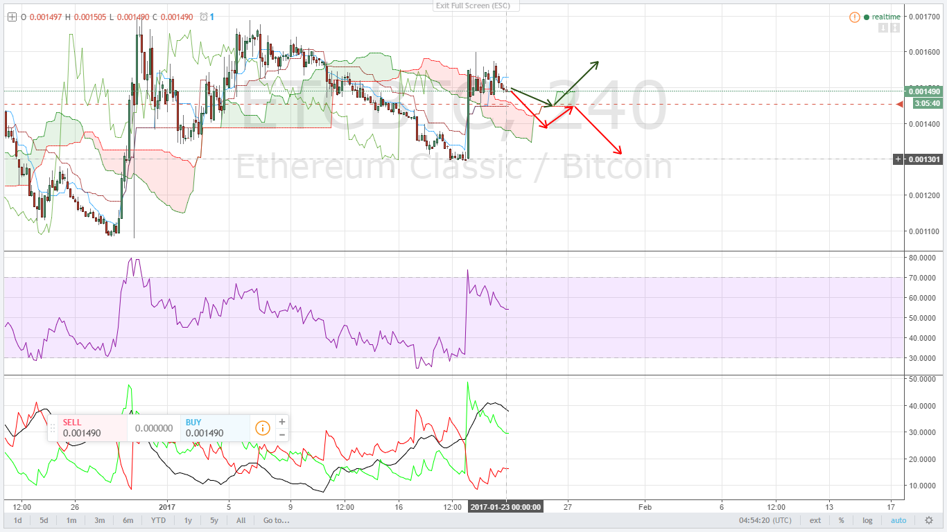 En el siguiente par tenemos el ETC/BTC, hace unos días atrás recordemos que el valor de Ethereum Classic oscilaba por los $0.88 USD para luego tener una fuerte proyección hacia $1.20 o equivalente a BTC y realizar unas leves correcciones en el siguente gráfico en temporalidad de 4 horas vemos como el precio ha tenido un comportamiento de correcciones e impulsos al alza, en base al analisis técnico aplicando el uso del indicador ichimoku es posible que el precio realice otra correccion justo done se encuentra el soporte de la nube para luego continuar su camino al alza.