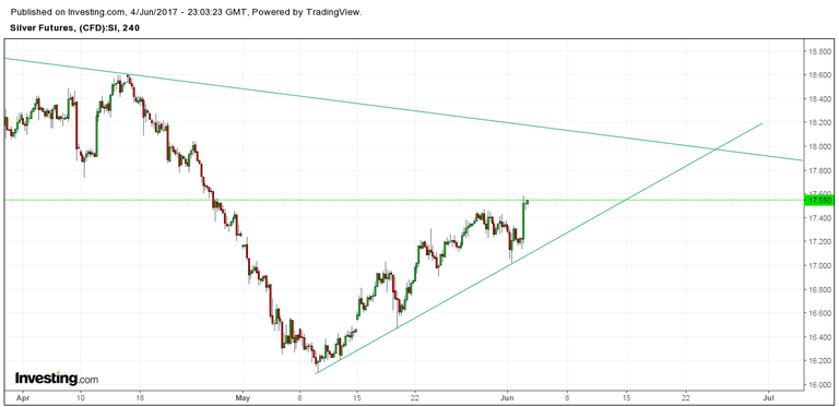 Uptrend since my first post has been holding nicely so far. I note that the longer downtrend resistance will be at around 18.2 in beginning of week and about 18.1 this Friday. Uptrend will be at around 17.1 beginning of this week and 17.4 by Friday close.