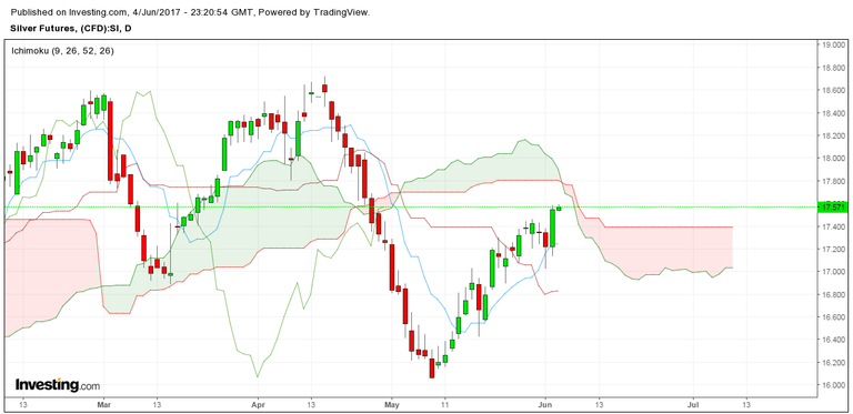 Things look much more bearish on the daily chart. We have res @17.65 currently at the kumo cloud. Cloud is currently descending.
