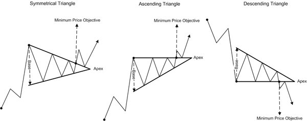 To draw a triangle on the chart you need at least 4 points: 2 points on support line and 2 points on resistance line.