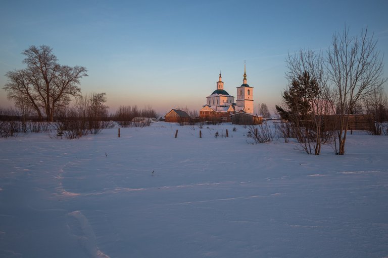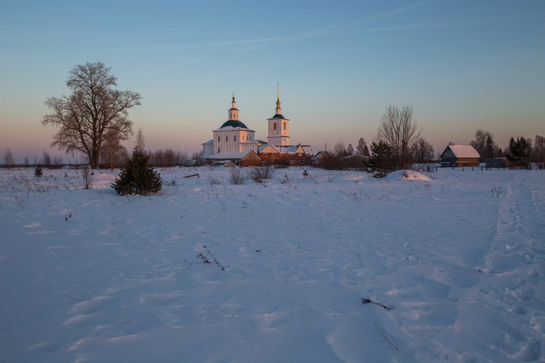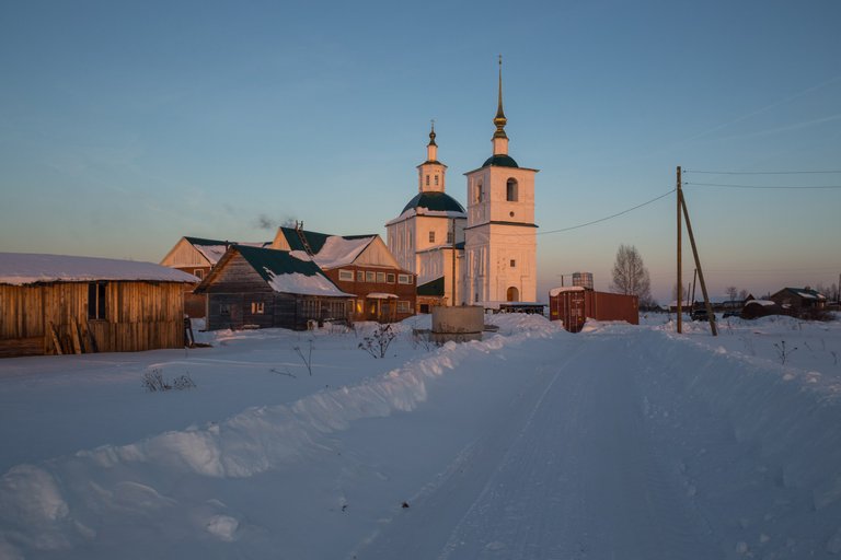 The village of Komaritsa was located on the most important at that time trading Sukhono-Dvinsky route from Moscow to the only external port of the country - Arkhangelsk. Large pier, commercial buildings, noisy fairs. Sold to all corners of bread, meat, boats, shits, oblas, boards and nasal for the transport of goods along the Dvina. Life was boiling. All this has sunk in the centuries. From the once large settlement Komaritsa turned into a small village with a few squint houses near the church.